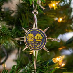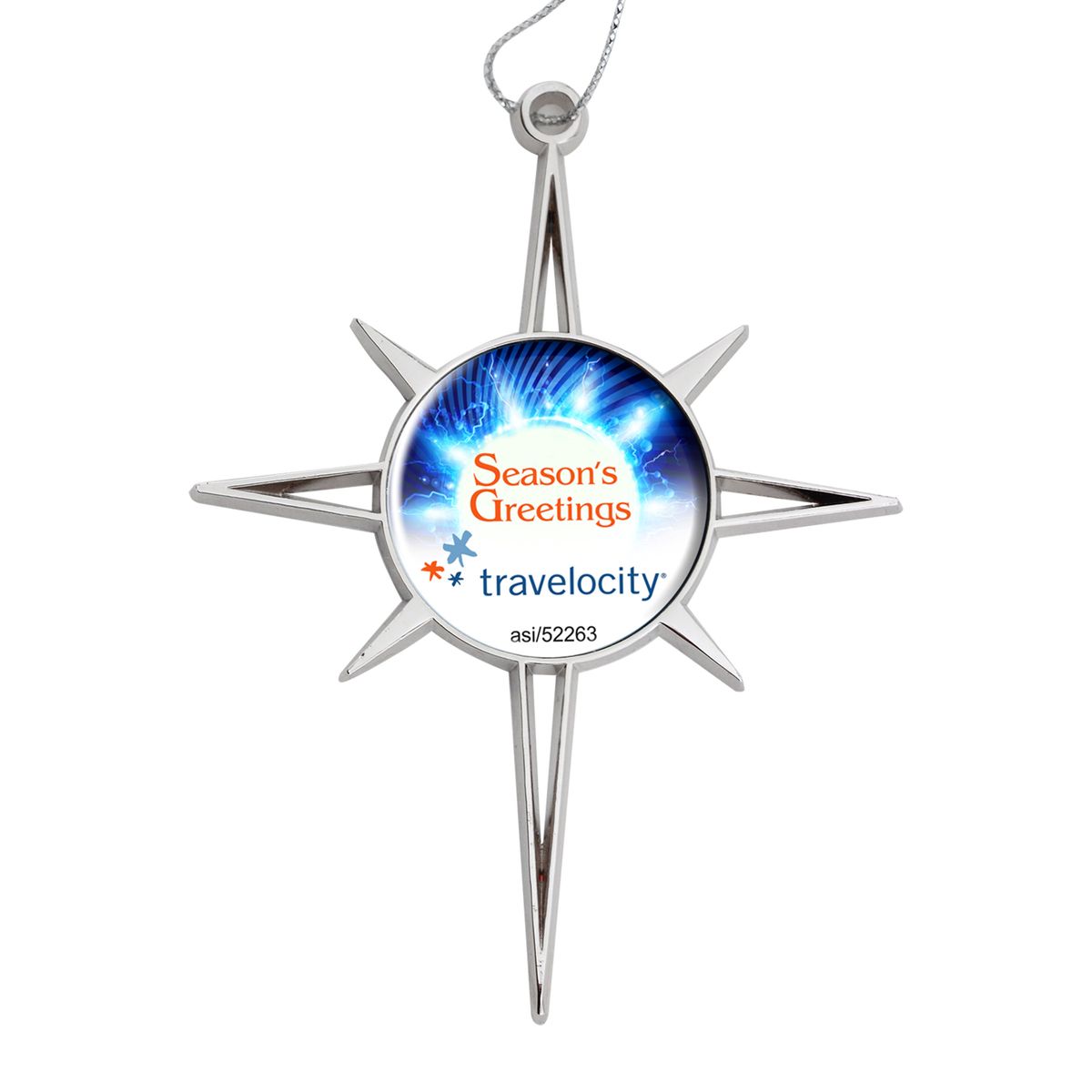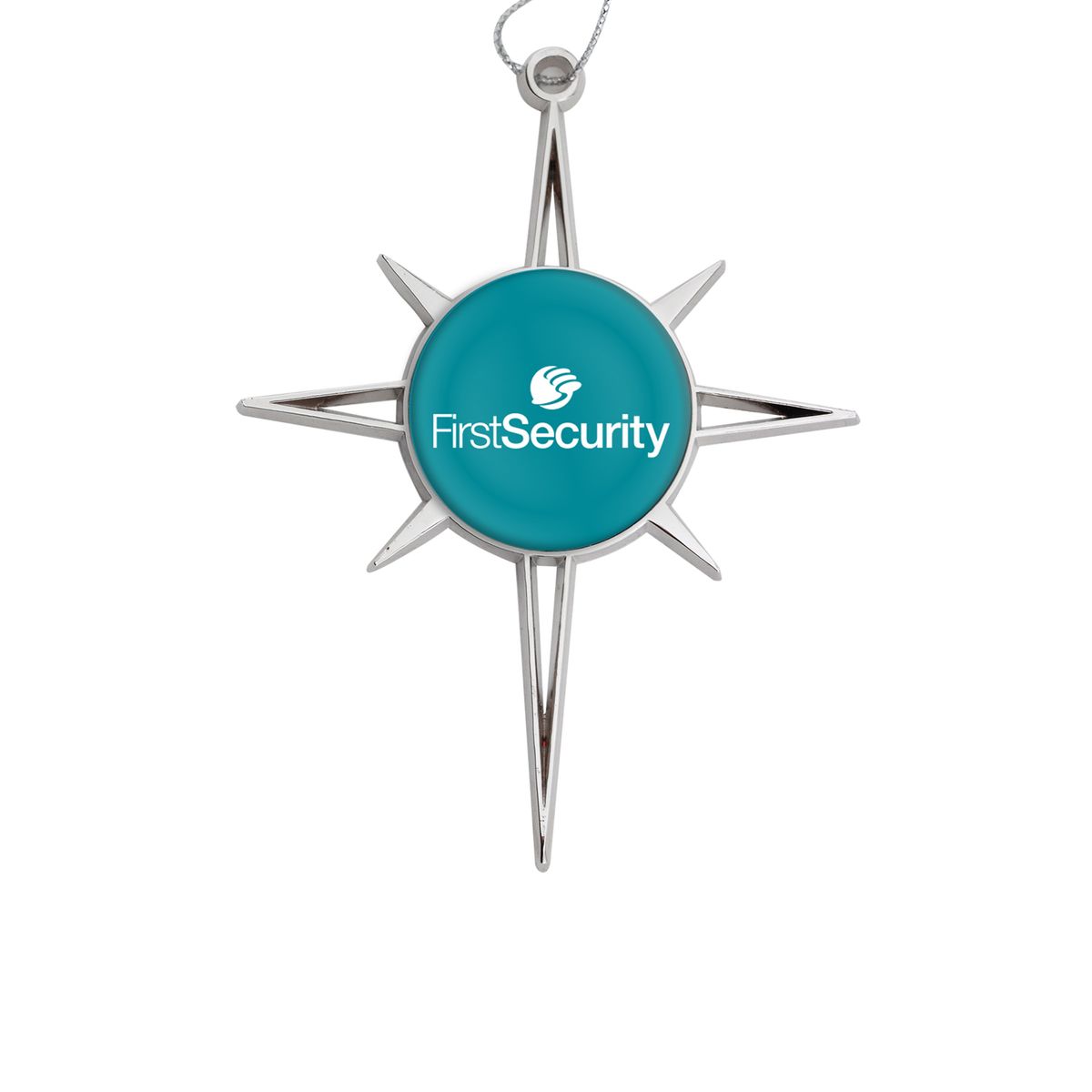 Create a thoughtful branded holiday gift for customers and supporters this season with this modern Star of Bethlehem Christmas ornament. Die cast in zinc alloy, this ornament features a bright nickel finish and a full color imprint.